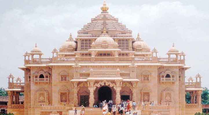 Swaminarayan Akshardham in Gandhinagar, Gujarat is a large Hindu temple complex inspired by Pramukh Swami, the current spiritual head of BAPS Swaminarayan Sanstha. Located in the capital of Gujarat, the complex was built over 13 years and is a tribute to Swaminarayan and his life and teachings. At the center of the 23-acre complex is the Akshardham mandir, which is built from 6,000 metric tons of pink sandstone from Rajasthan. The complex’s name refers to the divine abode of Swaminarayan in the BAPS philosophy; followers of Swaminarayan believe that the jiva or soul goes to Akshardham after attaining moksha, or liberation. BAPS followers worship Swaminarayan as God almighty.